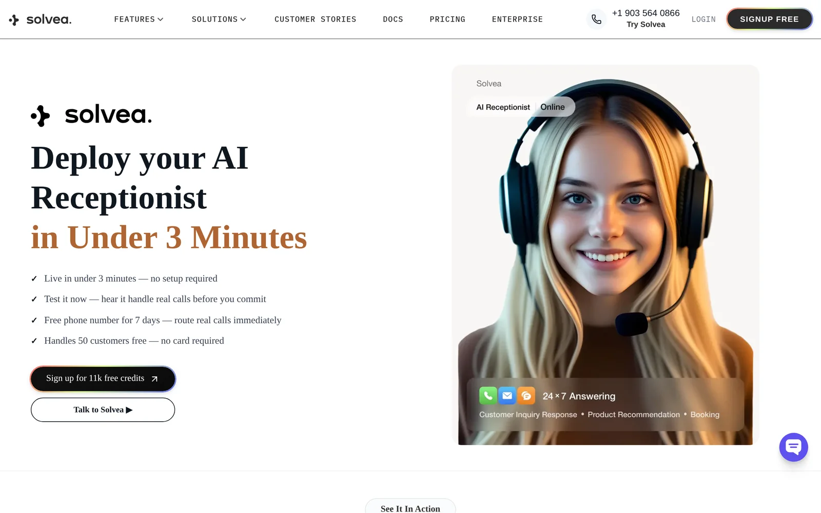 Solvea is a no-code, AI-powered receptionist platform that lets businesses build and deploy virtual receptionists without deep engineering resources. The platform focuses on handling inbound voice, chat, and messaging interactions, capturing leads, booking appointments, and routing conversations to human agents when needed. Solvea emphasizes fast setup via templates and visual flow design, plus multichannel orchestration so a single receptionist configuration can serve phone, web chat, and messaging channels. Its value comes from reducing the time and technical barrier to deploy automated front-desk and customer triage experiences.