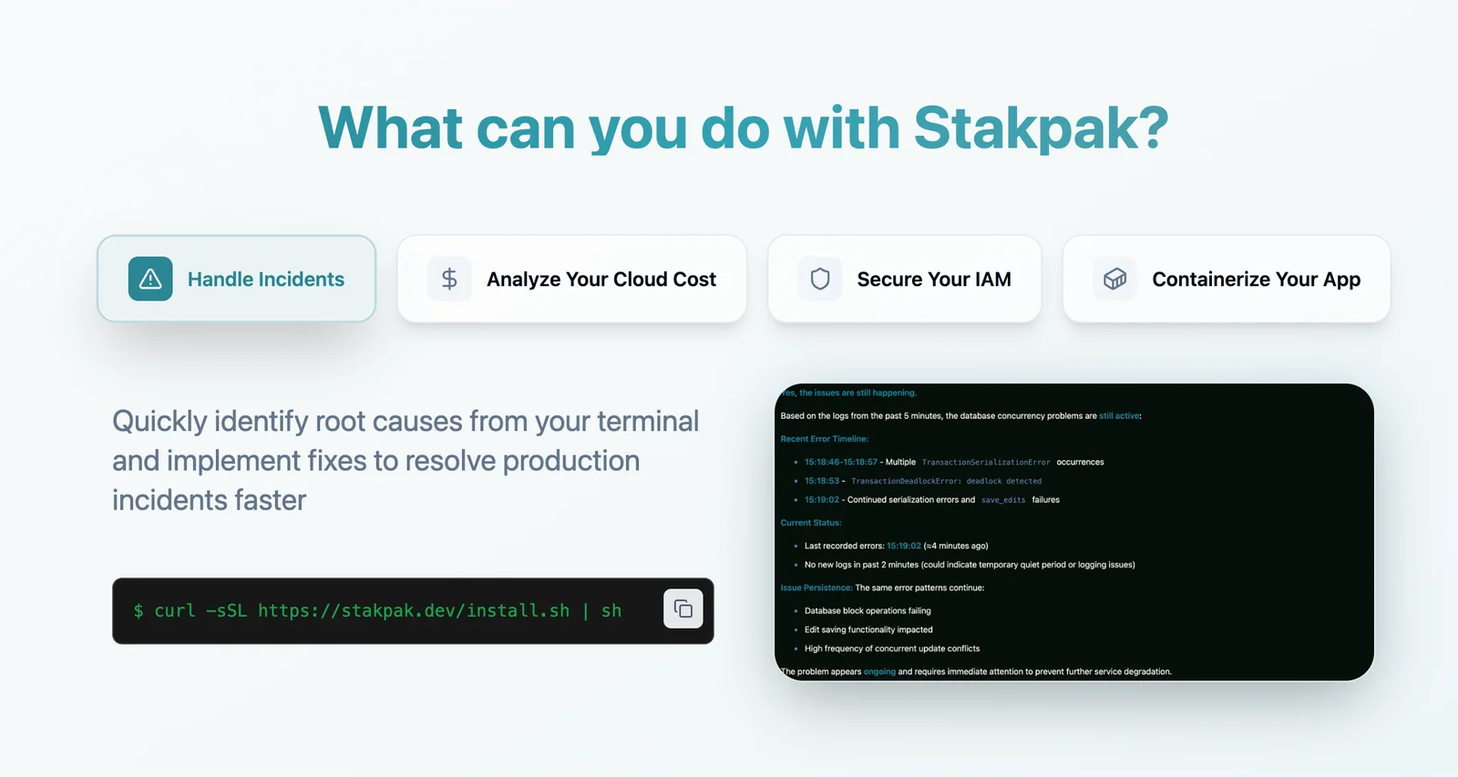 Stakpak is an open-source DevOps agent that runs in the terminal to help developers secure, deploy, and maintain production-ready infrastructure. Implemented as a Rust-based CLI, it interprets developer intent (via AI-driven command understanding) and automates common infrastructure and deployment tasks, reducing the need to manage complex configs manually. Stakpak's terminal-first interface provides a conversational and scriptable workflow for infrastructure operations while remaining extensible through its open-source repository.