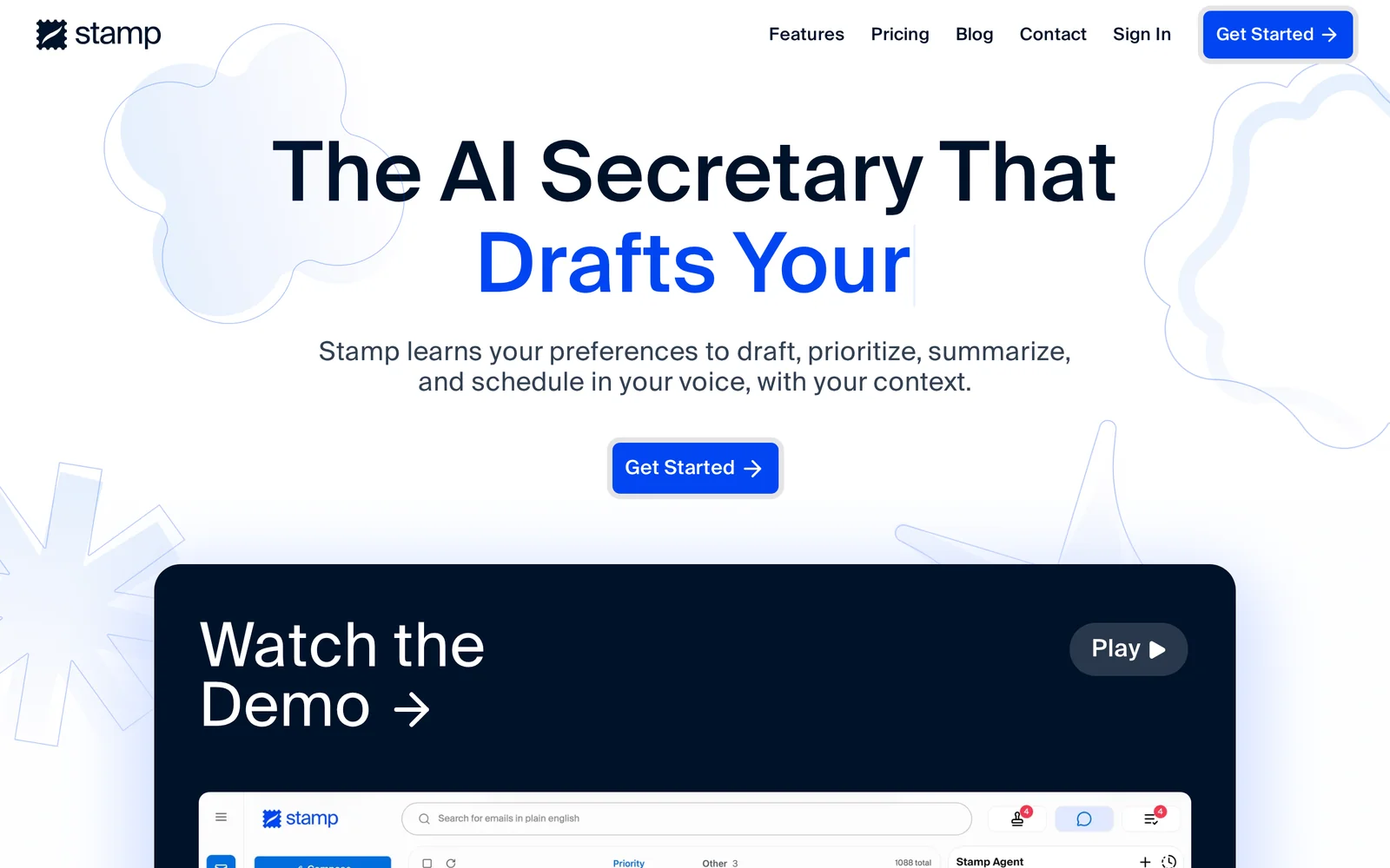 Stamp positions itself as an AI secretary that handles email and calendar work on behalf of users. It leverages natural-language understanding and generative capabilities to read and triage messages, draft or suggest replies, summarize threads, manage scheduling and calendar events, and surface follow-ups and reminders. The service is intended to reduce time spent on routine inbox and scheduling tasks, improve response speed and consistency, and help users focus on higher-value work by automating repetitive email and calendar workflows.