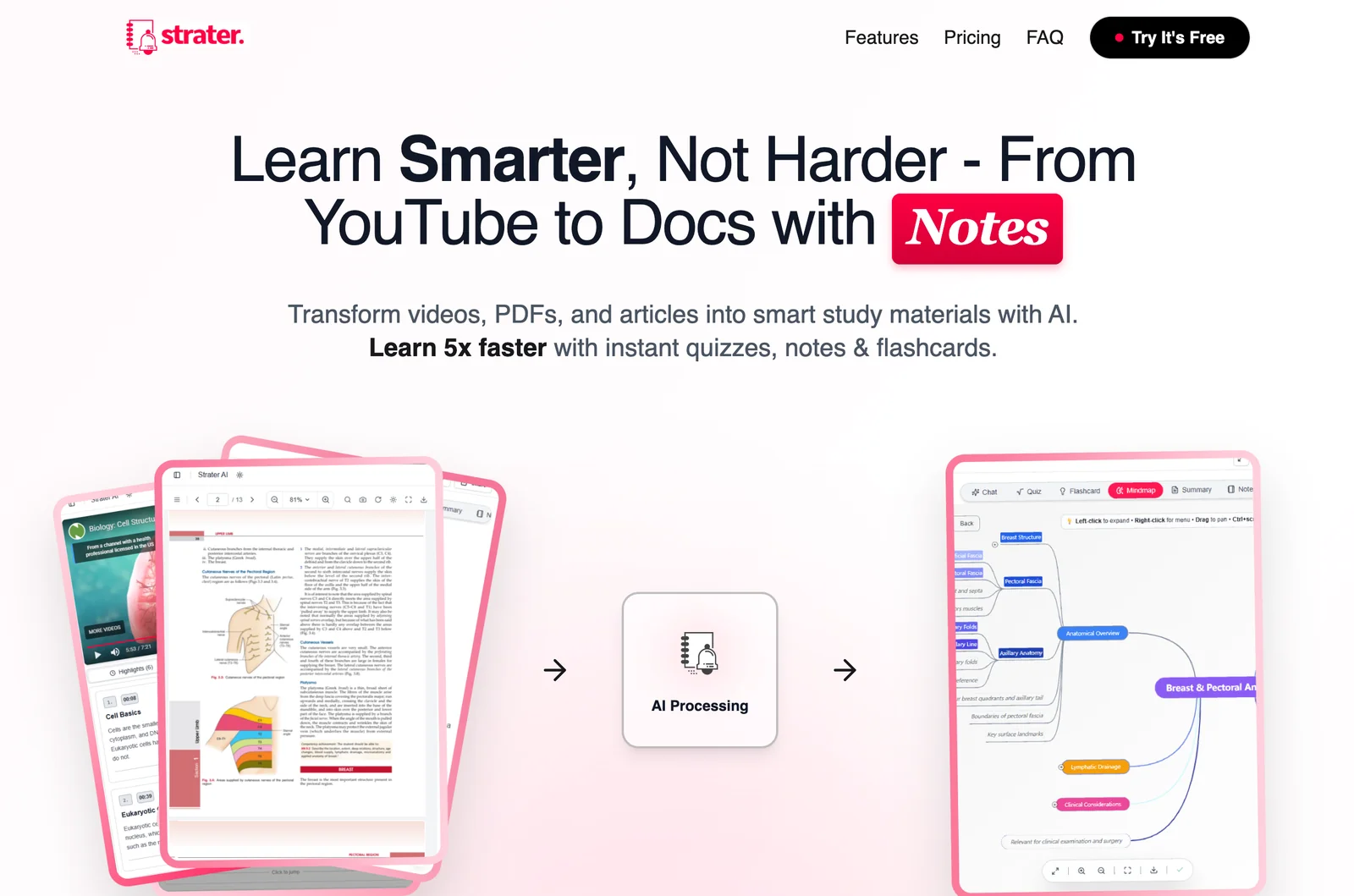 Strater AI is an AI-powered study companion that ingests content from YouTube videos, PDFs, and other documents and transforms it into structured study materials. The tool automatically generates concise notes, flashcards, quizzes, and summaries to help users learn more efficiently and retain information longer. By centralizing multi-format learning materials and producing active-recall study assets, Strater AI aims to speed up review cycles and improve long-term memory retention for students and lifelong learners.