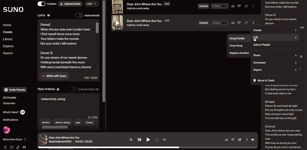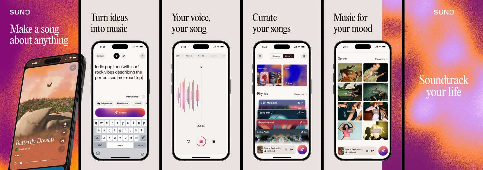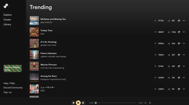 Create original songs, vocals, and audio quickly from text prompts using Suno's music-generation platform and models.