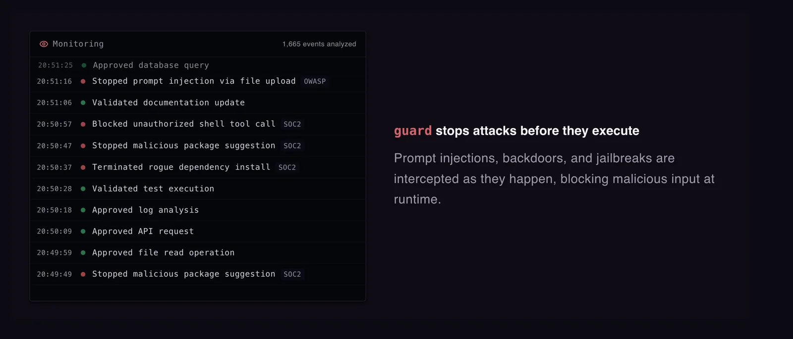 Open-source AI security platform that provides runtime protection for agents, prevents data leaks, and offers hosted compliance trust centers.
