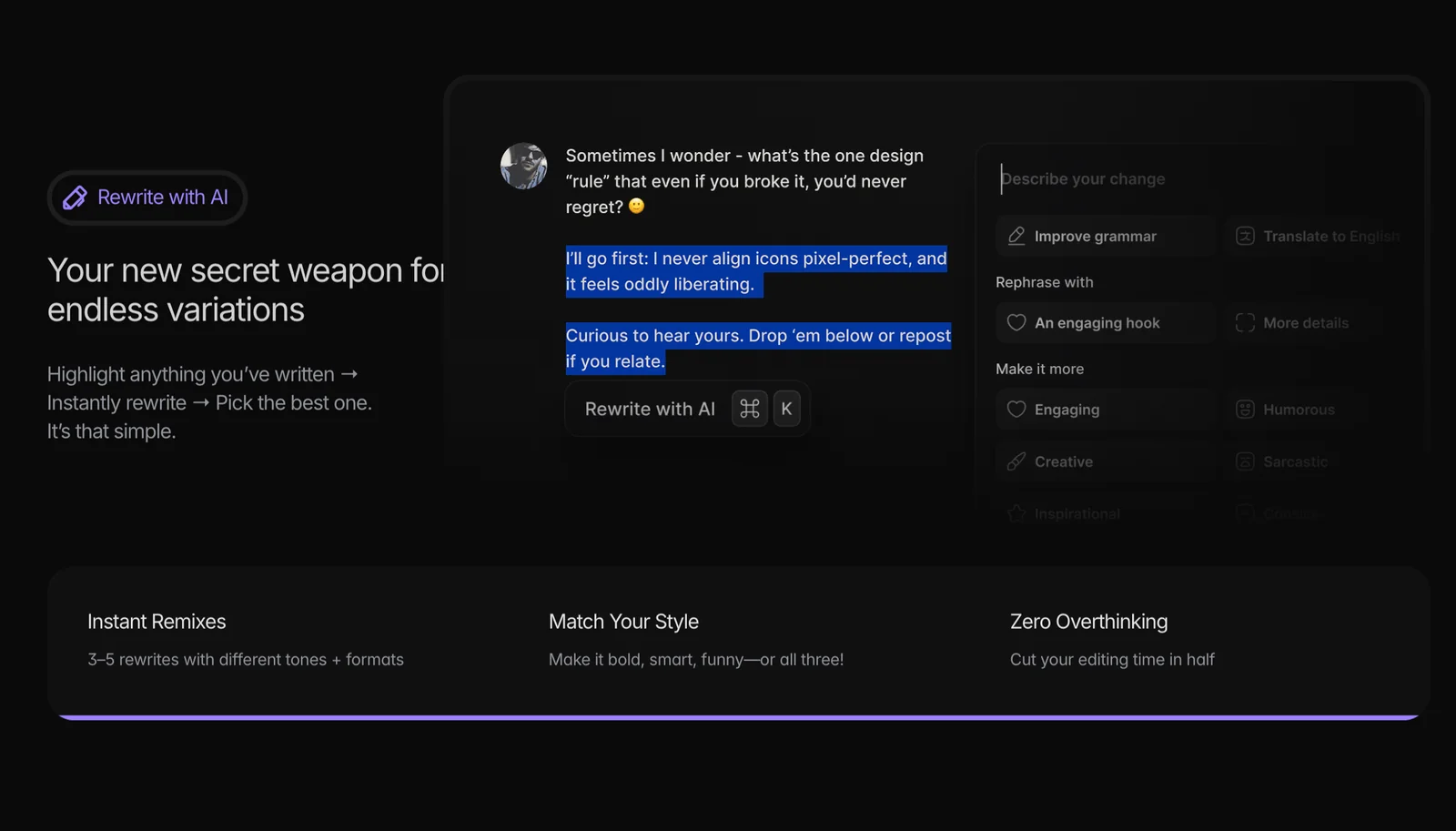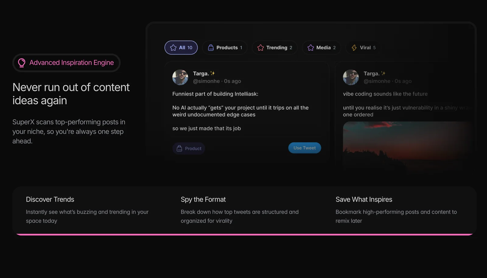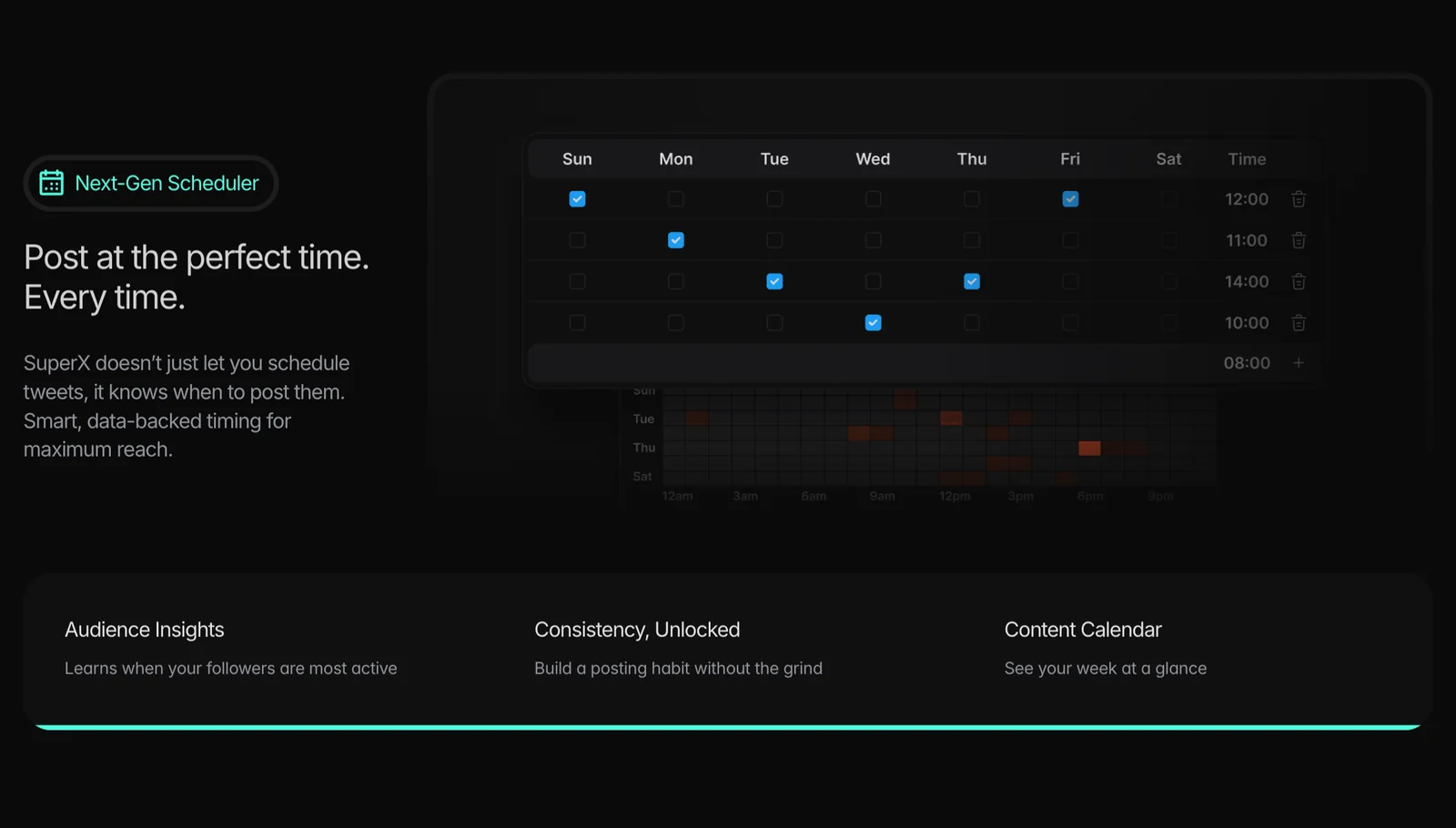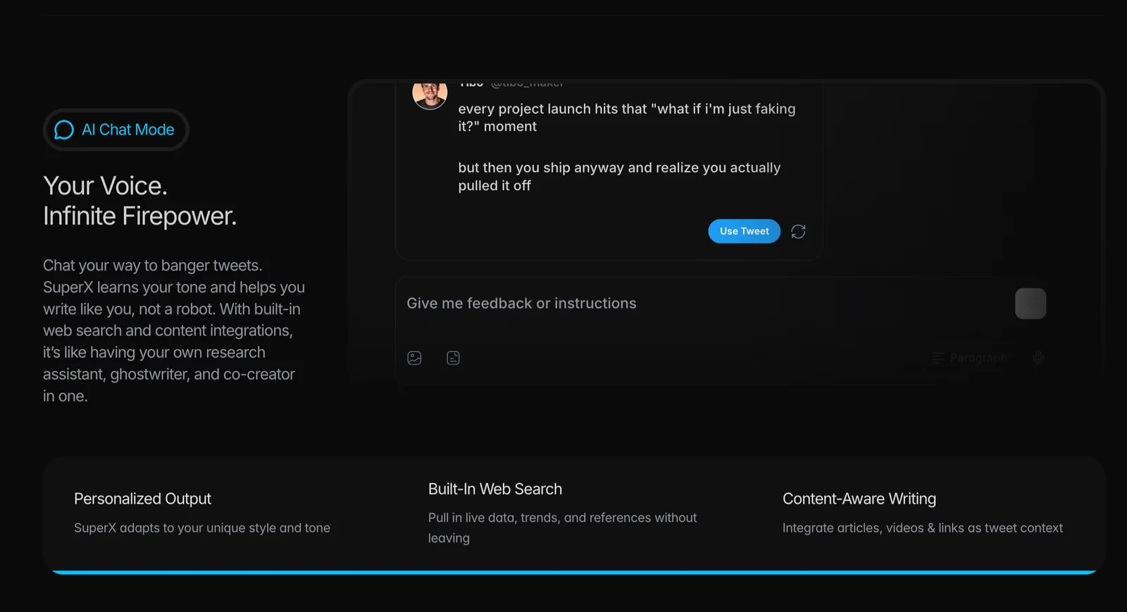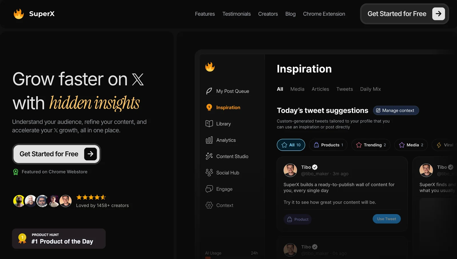 SuperX is an AI-driven platform built to help creators on X (formerly Twitter) grow and monetize their audiences. It analyzes a creator's profile and audience engagement signals to provide personalized content inspiration, draft authentic-sounding posts, and recommend optimal posting times. The platform includes scheduling and publishing capabilities alongside actionable analytics that highlight which topics, formats, and posting patterns drive follower growth. SuperX's value comes from combining generative writing assistance with audience-focused insights and monetization guidance, enabling creators to plan, publish, measure, and convert audience attention more efficiently.