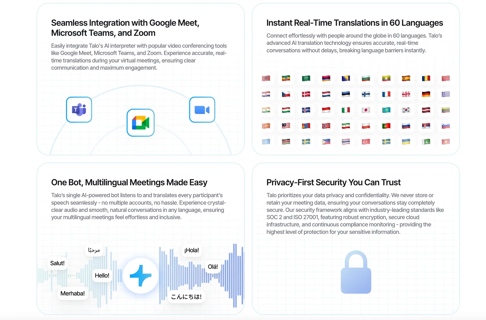 Talo provides real-time translation and captioning for video calls, enabling participants who speak different languages to communicate seamlessly. It transcribes spoken audio, translates it instantly into the participant's preferred language, and displays captions or translated text during live meetings. Talo is positioned for business use—helping international teams, customer support, and webinar hosts connect globally without language friction.