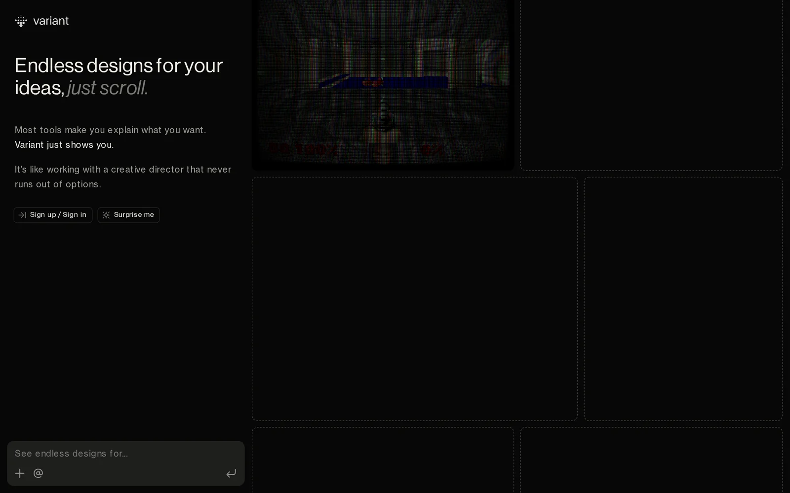 Variant is a web-based design generator that creates a continuous stream of UI designs from a single text idea. Users enter a concept for an app or website and Variant produces an endless, scrollable gallery of distinct visual and layout variations for rapid visual exploration. The tool is focused on fast ideation and inspiration, helping designers, founders, and product teams compare many directions quickly and seed prototypes or design conversations.