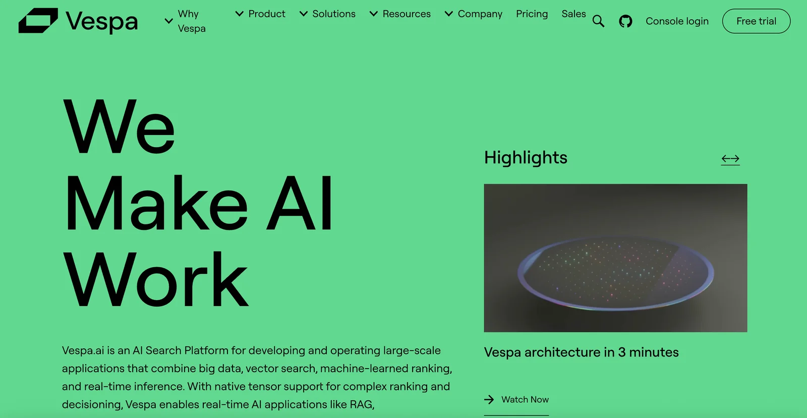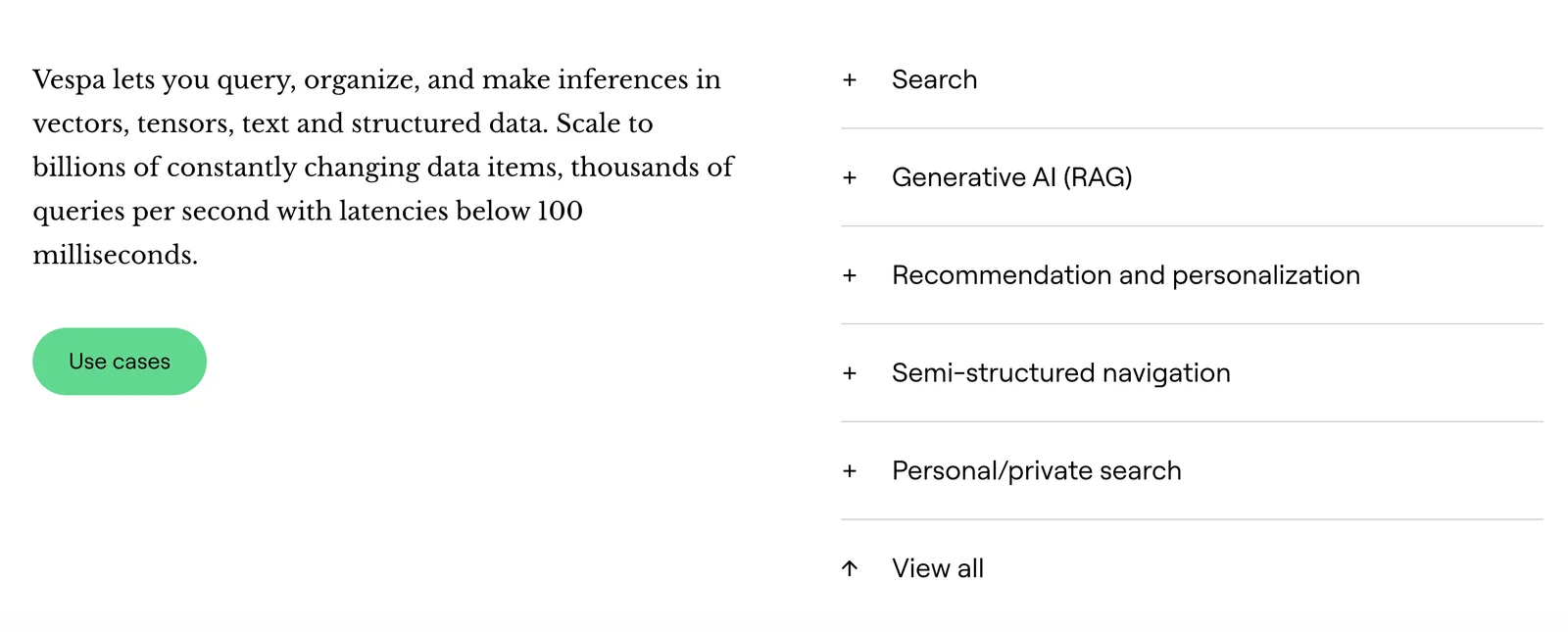 Vespa is an open-source big data serving engine that enables low-latency computation over large structured, text and vector datasets at user-serving time. It provides storage, retrieval, ranking and real-time computation so applications can perform relevance ranking, personalization, recommendations and real-time decisioning at scale. Vespa can be self-hosted under an Apache 2.0 license or consumed as a serverless managed service (Vespa Cloud); it also offers SDKs and APIs (including pyvespa) for deployment, prototyping and integration with ML/embedding workflows. The platform is optimized for production-grade performance, tight relevance control and streaming retrieval patterns used in retrieval-augmented generation (RAG) and large-scale search applications.