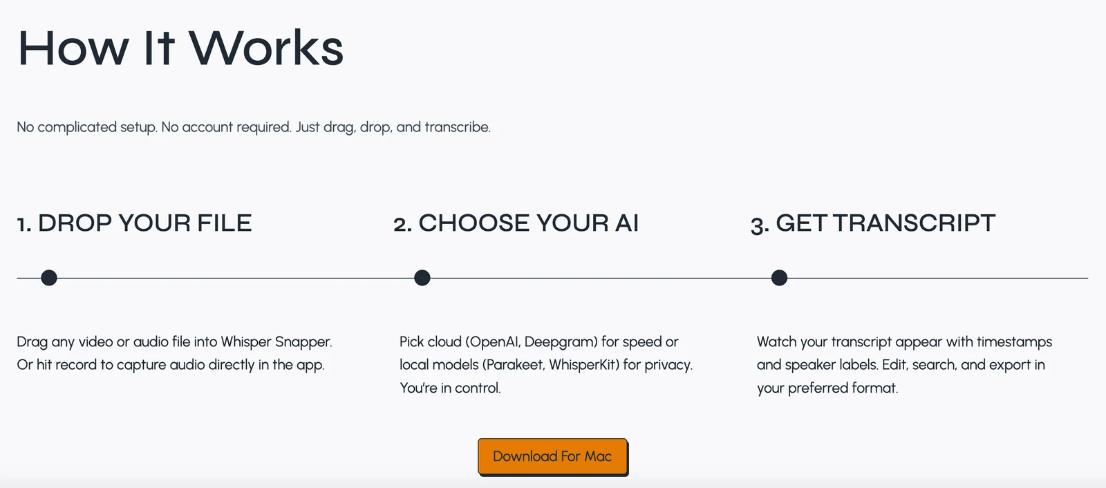 Whisper Snapper is a macOS application that uses Whisper-based speech recognition to transcribe audio into searchable text and captions. It focuses on local, privacy-minded transcription workflows on the Mac, letting users capture audio, generate transcripts, edit results, and export in common formats. The app is designed to streamline workflows for podcasters, journalists, researchers, and knowledge workers who need accurate, editable transcripts and subtitle files directly on their Mac.