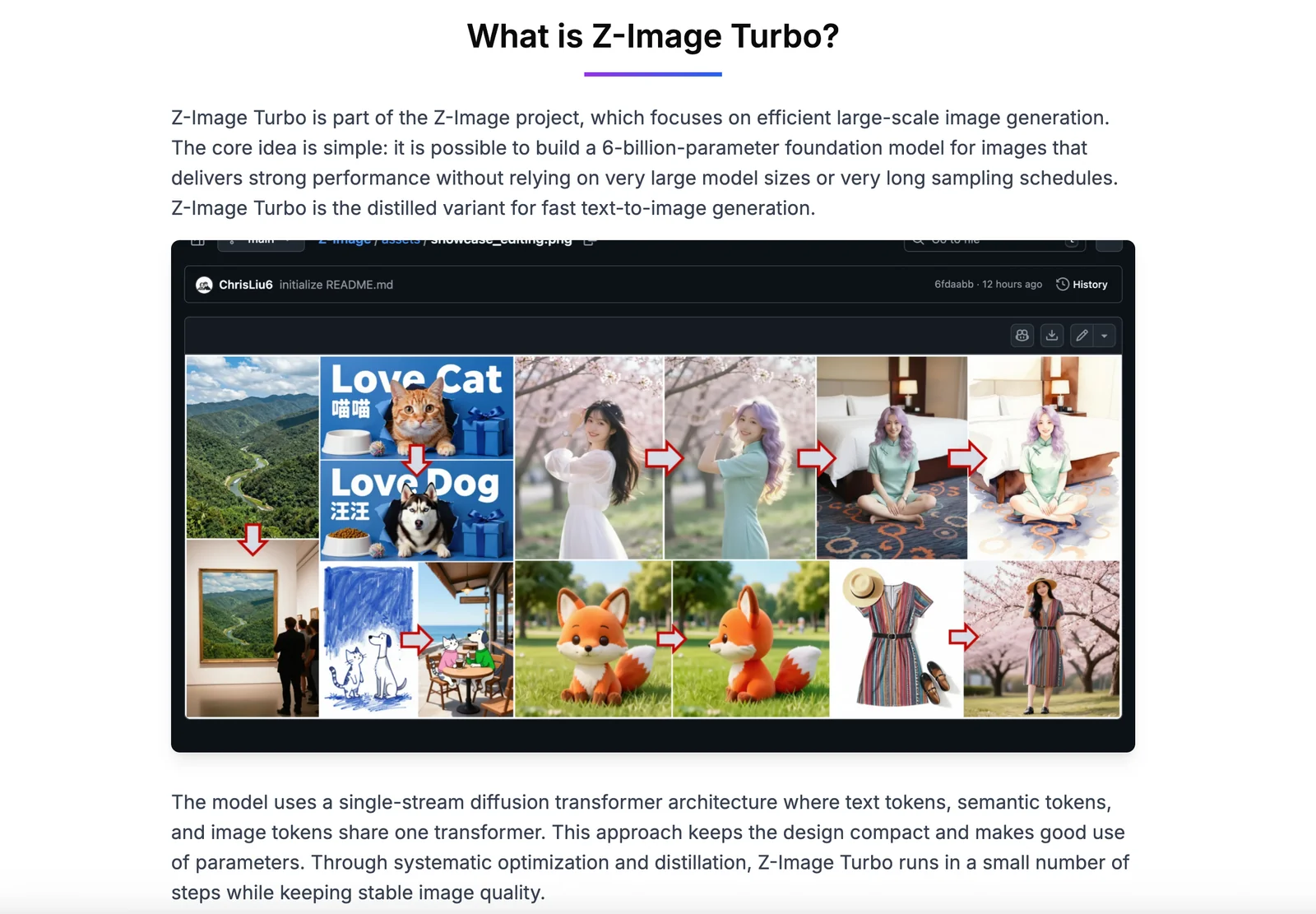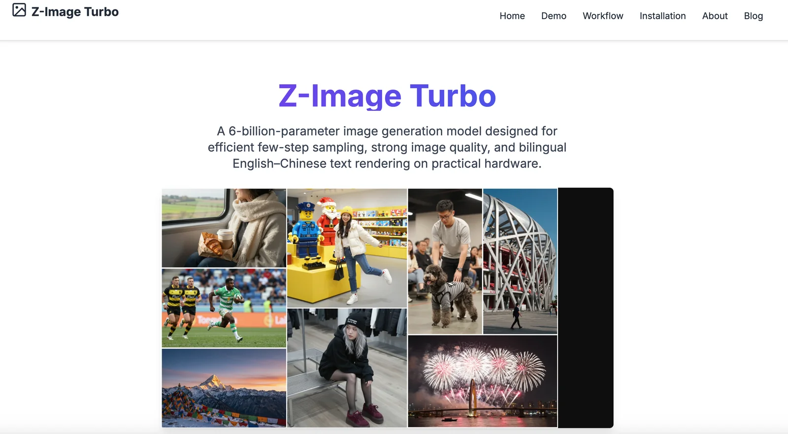 A 6B-parameter, efficient text-to-image model (Z-Image-Turbo) optimized for few-step sampling, photorealism, and English–Chinese text rendering.